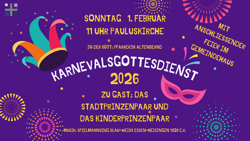 Am 1. Februar wird es bunt und laut: Das Stadtprinzenpaar und das Kinderprinzenpaar sind zu Gast in unserem Karnevalsgottesdienst und anschließend treten sie im Gemeindehaus bei unserer bunten Karnevalsparty auf. Also nicht verpassen! Der Gottesdienst des Jahres, bei dem ein Besuch im Kostüm ausdrücklich erwünscht ist!